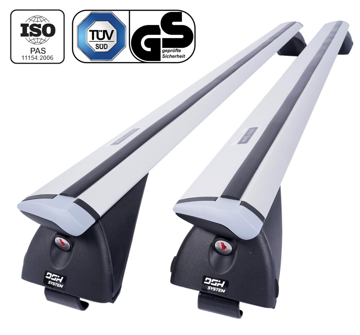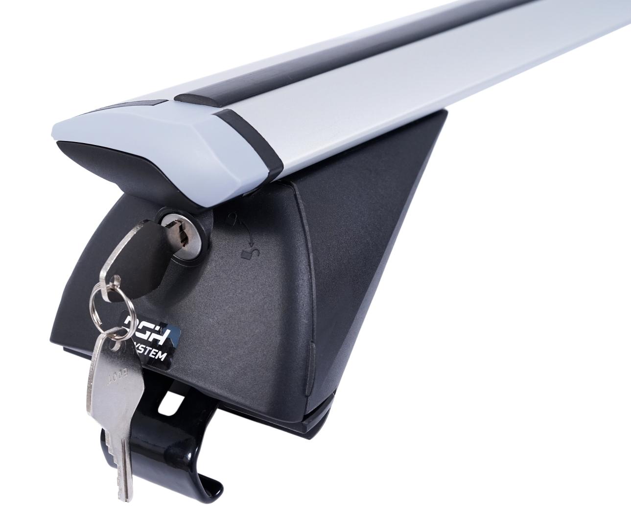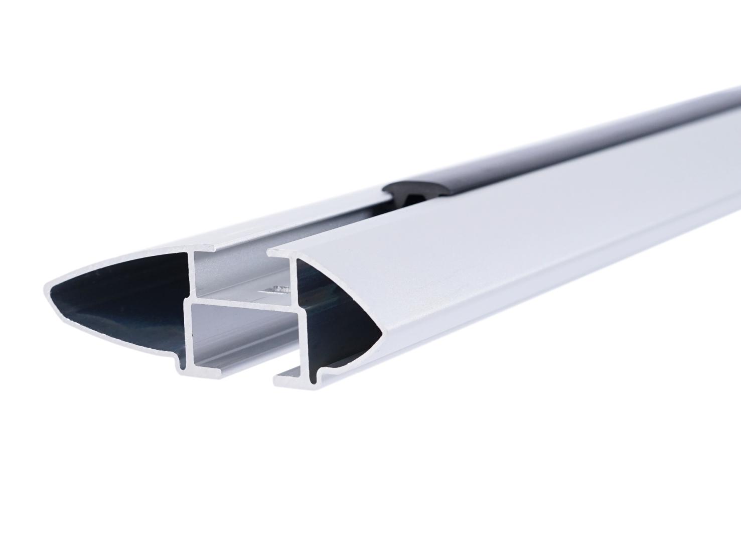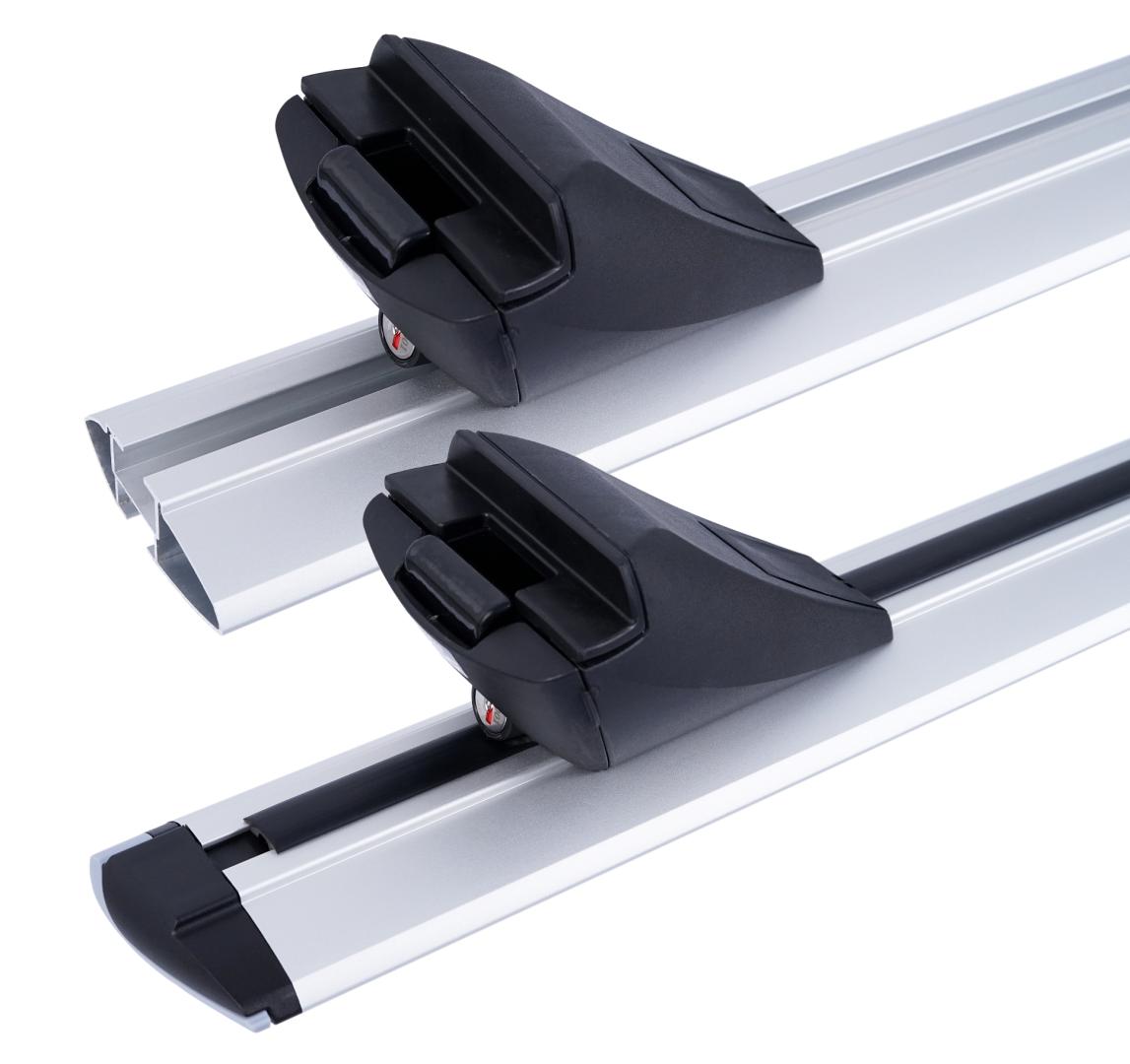 Kompletny, aluminiowy bagażnik bazowy pasujący do większości samochodów posiadających standardowe (otwarte), jak i zintegrowane (zamknięte) relingi dachowe.
